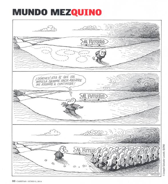 El nacimiento es la condición de no tener pasado y la muerte es la de no tener futuro. Nacimiento y muerte son uno en el momento presente. Coincidentia oppositorum. Pero el hombre de hoy sólo acepta la vida como duratividad vista desde el aspecto incoativo del nacimiento y rechaza incluir el aspecto terminativo de la muerte, aquello que se teme por encima de todas las cosas. De ahí que exacerba lo por venir. Rechazar la muerte es lo mismo que negarse a vivir sin futuro. La exigencia de futuro se acoge al régimen temporal de la promesa. El hombre concreta ese régimen en el compromiso de ni siquiera olfatear la muerte o hablar de ella en este momento presente. El miedo a la muerte, ora sutil, ora manifiesto, le impulsa a programar, a proyectar, a planear; en suma, a tener en cuenta el mañana. Le hace buscar un futuro, apuntar hacia él, anhelarlo, procurar alcanzarlo, caminar hacia él. Genera en su cuerpo propio una intensa sensación de tiempo: exige, crea, vive tiempo y más tiempo. Al ser esa la posesión más preciada, el apuntamiento al futuro es el objetivo central, como se ve en las tres viñetas. Cada momento es vivido de paso, en la espera, en la insatisfacción. El nunc stans, presente intemporal, se reduce al nunc fluens, presente fugitivo, pasajero, ese que dura pocos segundos.9 Esperamos que cada momento pase a continuarse en un momento futuro. Así, precipitándose en un futuro persistentemente imaginado el sujeto cree evitar la muerte.10