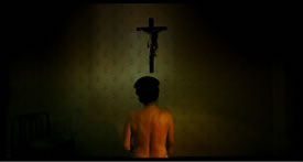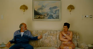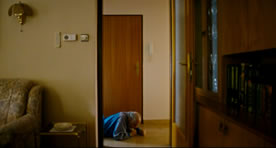 Así, (i) la escena en la casa de la familia de unos emigrados aparece como el grado cero con relación a la temática de lo carnal; la presencia del hijo enfermo, revelada de repente al final, introduce, sin embargo, el rasgo de irregularidad que se inmiscuye en la norma: Anna Maria lo rocía con agua bendita: “la necesita de manera especial”. Viene luego (ii) la escena con el Señor Rupnik: podríamos ver manifestarse, en la desnudez del hombre y la errancia de su espíritu, así como en el desorden excesivo del departamento, una libertad ya total. Desalineado, después del fallecimiento de su madre, al fin puede, literalmente, hacer lo que le plazca. Rezar juntos resulta imposible, el Señor Rupnik salpica con sus reflexiones el Padre Nuestro (Fig. 2).