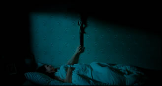 Otra oposición muy obvia en el espacio fílmico interviene según el eje arriba/abajo. Las actuaciones de los protagonistas están ubicadas en la parte baja de la imagen: Anna Maria en oración o recorriendo de rodillas su departamento y rezando el Rosario; Nabil, desprovisto de su silla de ruedas, reptando en sentido contrario. Los cuerpos en lucha están ubicados en la parte inferior de la imagen, los cuerpos enfrentados. Este espacio bajo, lleno de movimiento, se opone al espacio superior, sin movimiento, tranquilo, un espacio de paz. La paz reina en toda la casa antes del regreso de Nabil. Cada vez que Anna Maria entra en la habitación-gabinete, la cámara ya está ahí, se crea la sensación de que alguien la estaba esperando. La sensación de una presencia apacible que habita el campo mismo es comprobada por el hecho que es hacia ella que Anna Maria dirige sus plegarias. La oposición arriba/abajo a veces es puesta de relieve por un ligero plano en picada o en contrapicada. Se constituye un actante cuerpo-punto (Fontanille, 2011: 99), una posición de referencia deíctica muy móvil, susceptible de aparecer y desaparecer en la duración del plano mismo (Fig. 7). Las relaciones de homologación se precisan como sigue: