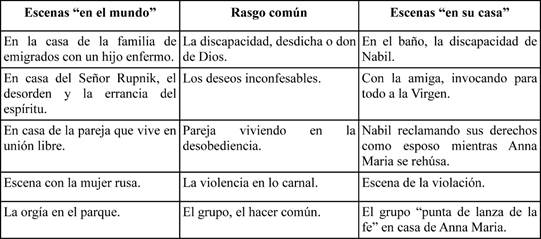 Las escenas de la segunda serie se desarrollan en la casa de Anna Maria y aparecen como una reanudación en eco de las escenas “en el mundo”. El cuadro que sigue (Fig. 3) presenta estas dos series de escenas con, en su parte media, el rasgo común que permite ver que el eco que se reenvían adquiere a menudo un tono irrisorio. Así, la errancia de espíritu del Sr. Rupnik es invertido en el discurso de la amiga de Anna Maria, creyente ferviente, que invoca continuamente y para todo a la Virgen, hasta involucrarla en los problemas de digestión de su gato. Otro ejemplo es la relación en eco entre la escena-disputa en casa de la pareja que vive en unión libre y la escena entre Anna Maria y Nabil, quien reclama sus derechos como esposo, a lo que Anna Maria se rehúsa: ambas parejas viven, por así decirlo, en la desobediencia, si bien de manera contraria. Se perfila aquí una brecha entre el hacer según la voluntad de Dios y hacer su propia voluntad, creyendo hacer la de Dios.