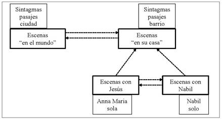 Sin contar los sintagmas de pasajes en la ciudad y en el barrio de Anna Maria, así como aquellos en los que ella o Nabil permanecen solos, podríamos delimitar dos sub-series de escenas “en su casa”, las que también se responden en eco. Por una parte, las escenas que constituyen la relación muy afectiva de Anna Maria con Jesús: oraciones, flagelaciones, manifestaciones de ternura de todo tipo y hasta la escena de ira al final, a las que se oponen las escenas con Nabil, el esposo de Anna Maria, y su relación carente de afecto. El esquema siguiente visualiza la simetría parcial en la organización del relato en eco (Fig. 4).