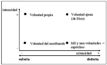 Así, la película hace resurgir la cuestión primordial de la categoría de la /voluntad propia/. Veamos primero su contenido semántico. El diccionario CNRTL opone deseo a voluntad: el deseo es pasivo e impersonal, la voluntad es el tipo mismo de la actividad y de la personalidad. La voluntad es, pues, especificada por la intensidad del querer. La triple modalización —deber-poder-querer— que aparece en Kant (Agamben, 2013) demuestra, en efecto, la necesidad de contrarrestar, por el deber, el muy poderoso querer que conjuga el poder en cuanto se convierte en un querer-hacer. Por el contrario, hacer según la voluntad de otro tiene una carga disfórica: es cómo actuar según “el libre albedrío” de alguien más, a excepción de la “voluntad de un moribundo” que es “sagrada” (CNRTL), tomando en cuenta el aminoramiento de la intensidad y la disminución de la valencia de la extensión, pues es su última voluntad. En plural, al desaparecer la valencia de intensidad, aparece la inconsecuencia: Las voluntades son libres, o bien el capricho: “hacer las mil y una voluntades de alguien”. Existe, pues, un eje de investimiento euforia/disforia según las oposiciones yo/otro y unitario/múltiple, representado en el esquema (Fig. 9) por la flecha de doble sentido.