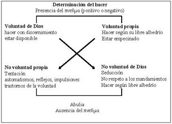 Y agrega: “Para aquel que lo logra, esto le será reconocido como sacrificio” (p. 134). En la Iglesia católica, separada de la Iglesia ortodoxa a partir del cisma de 1054, parece que dicha idea se haya perdido; la comprensión de que la voluntad propia esté en la raíz del pecado original vuelve a aparecer en San Francisco de Asís, según Agamben (2011: 189).5 Algunos filósofos han “percibido el fondo demoniaco de la libertad humana”, según la expresión de Ricœur (1994: 223). El cuadrado semiótico que sigue (Fig. 10) muestra la repartición de las ocurrencias del querer-hacer según que el hacer esté conforme a la /voluntad propia/ o con la /voluntad de Dios/. En ambos casos, el πνεῦμα, en tanto actante-fuerza adyuvante del hacer, está presente, positivo o negativo. Por el contrario, está ausente en el antónimo de la voluntad, abulia, definida como “trastorno mental caracterizado por la disminución o la privación de la voluntad, es decir por la incapacidad de orientar y de coordinar el pensamiento en un proyecto de acción o una conducta eficiente” (CNRTL). Ni voluntad propia ni voluntad de Dios, la abulia representa el término neutro.