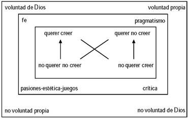 A continuación, presentamos un diagrama que reúne el cuadrado de la categoría de la fe y el de la voluntad (Fig. 11). Vemos así las relaciones de homologación de los términos que provienen de /querer creer/ y de /querer hacer/.