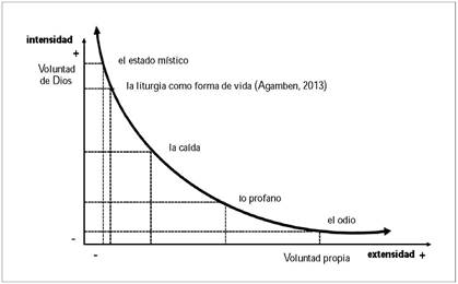 La forma de vida de la fe podría ser representada como una relación tensiva entre la /voluntad de Dios/ y la /voluntad propia/, el primer término sirviendo como valencia de la intensidad, y el segundo como valencia de la extensidad (Fig. 12), según la oposición revelada en las palabras: “Marta, Marta, tú andas preocupada y te pierdes en mil cosas: una sola es necesaria” (Lc 10:41-42). Desde esta perspectiva, la única cosa necesaria es confiar su ser y su hacer a Dios. La crisis en la fe, en este caso la caída, estará marcada por la dominación de la /voluntad propia/, y, mientras se prolonga en un /querer no creer/, constituirá lo profano; hasta podrá llegar a la blasfemia y aún más lejos, hasta el odio, si se refiere a Jean-Paul Sartre quien afirma que “el odio es una fe” (1948: 18). E inversamente, al acercarse al eje de la intensidad, encontraremos lo que Agamben define como “liturgia como forma de vida”, y, acercándonos aún más al eje de la intensidad, alcanzaremos un estado místico, considerado como enteramente en la voluntad de Dios. Al recordar lo siguiente: “El que no ama no ha conocido a Dios, pues Dios es amor” (1 Jn 4:8), volveremos a encontrar los dos estados pasionales: el odio y el amor.
