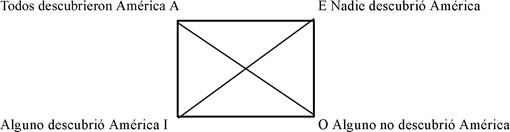 Los presupuestos nos permiten afirmar que sus contradictorios, las oraciones universales, son falsos puesto que no todos descubrieron América y también es falso que ninguno lo hizo. Las oraciones particulares son ambas verdaderas pues alguien (Colón) lo hizo y alguien (digamos Magallanes) no lo hizo. En este cuadrado de presupuestos las universales son falsas y las particulares verdaderas (o al menos se cree que son verdaderas) (Fig. 1).
