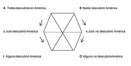 Podríamos incorporar el datum quaestionis y su contraparte negativa en un hexágono similar al de Sherwood, colocándolos a la mitad entre las oraciones universales y particulares (Fig. 4). Usando el simbolismo lógico usual, donde a: América, Dxa: x descubrió América, ∀x: cuantificador universal, ∃x: cuantificador particular, y ~ para la negación, tenemos:
