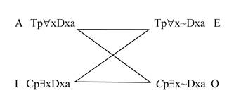 Sus contradictorias (la oración U) son: ~Cp∃xDxa y ~Cp∃x~Dxa, que son equivalentes a