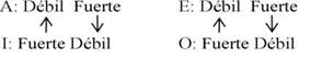 La oración A es universal o fuerte por el cuantificador pero particular o débil por el operador doxástico; lo mismo vale para la oración E. La oración I es universal o fuerte por el operador doxástico, pero particular o débil por el cuantificador; lo mismo vale para la oración O. Las oraciones A y E realmente son débiles, puesto que el operador T gobierna toda la expresión en ambos casos. Las oraciones I y O son fuertes puesto que están gobernadas por un operador fuerte, C. Tenemos pues un cuadrado patas arriba (Fig. 8).
